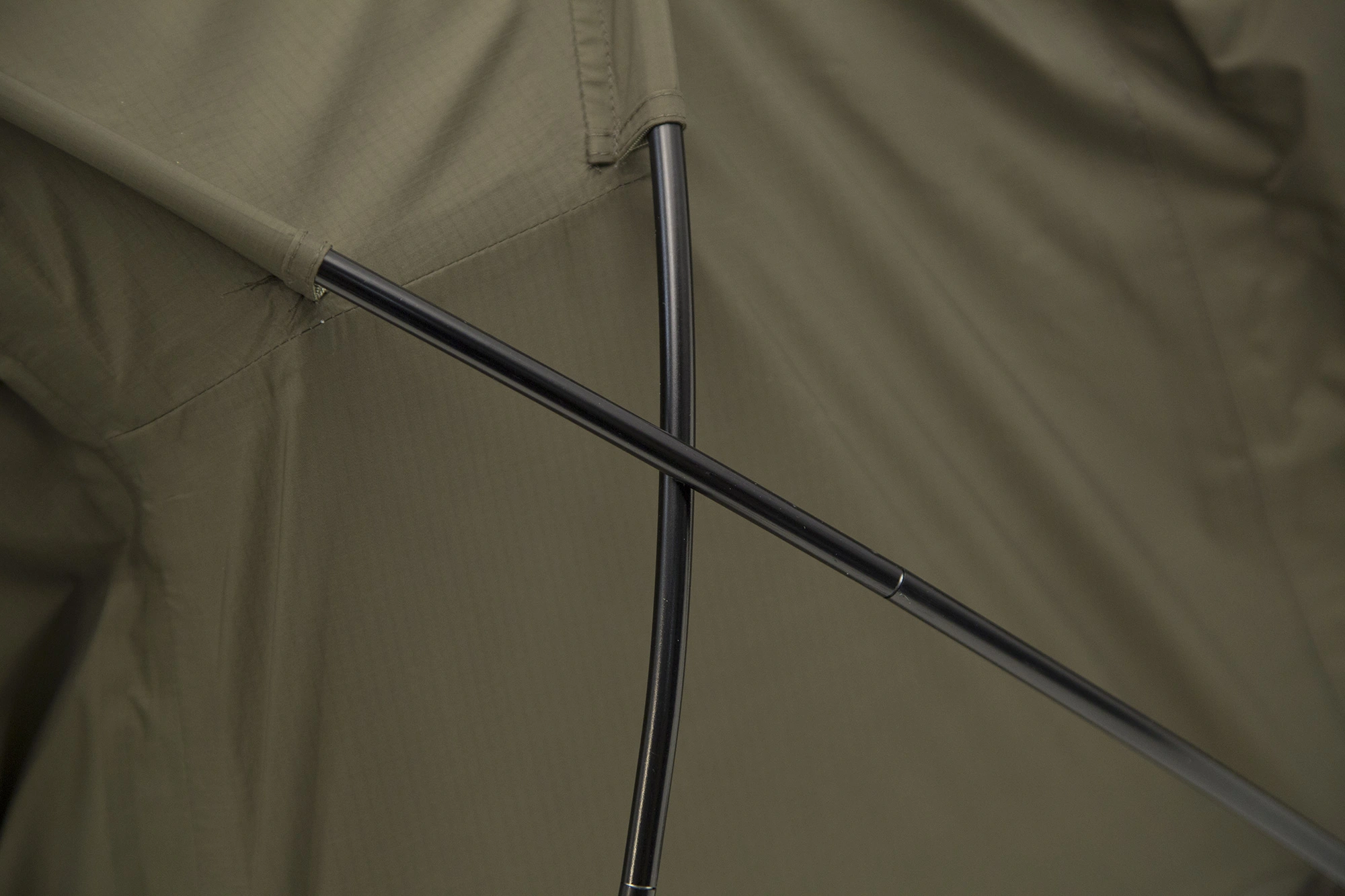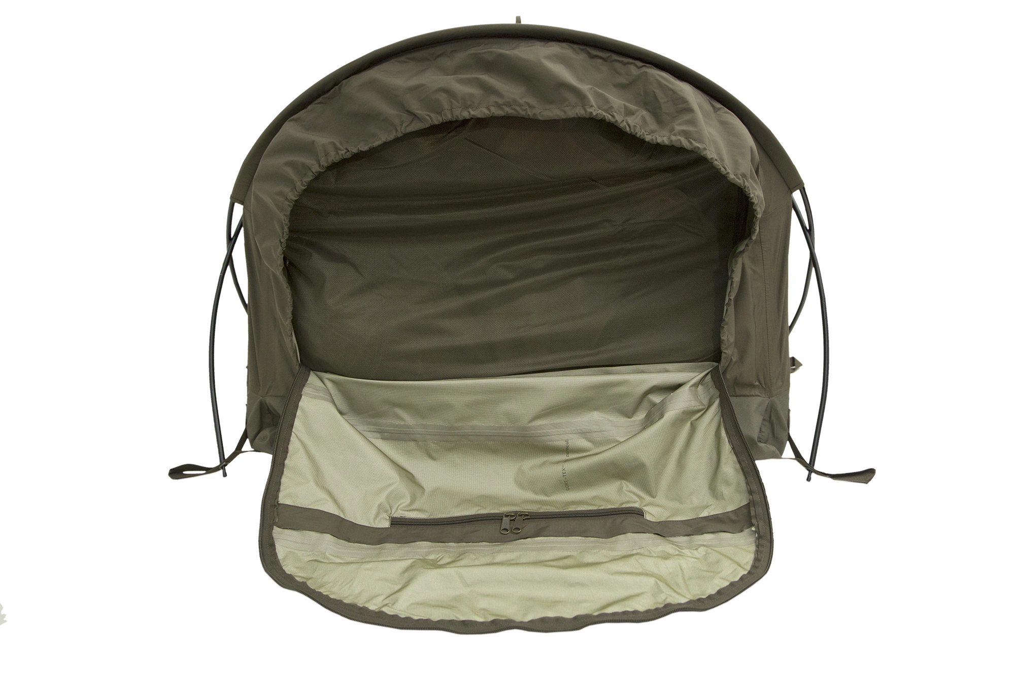 The perfect sniper bivy bag with self-standing double pole support. Two tent poles form a small dome at the head end which provides enough space for the user to handle a rifle or other piece of equipment. The bivy bag slopes down from the shoulder to the foot end thus preventing straight lines which are easily spotted. The L-shaped opening makes it convenient to get in and out of the bag which can be closed with 2 zippers. All zippers are protected by a specially designed storm flap to make them absolutely waterproof. The big observation opening at the front allows an observation range of 180° and can be closed completely in bad weather.