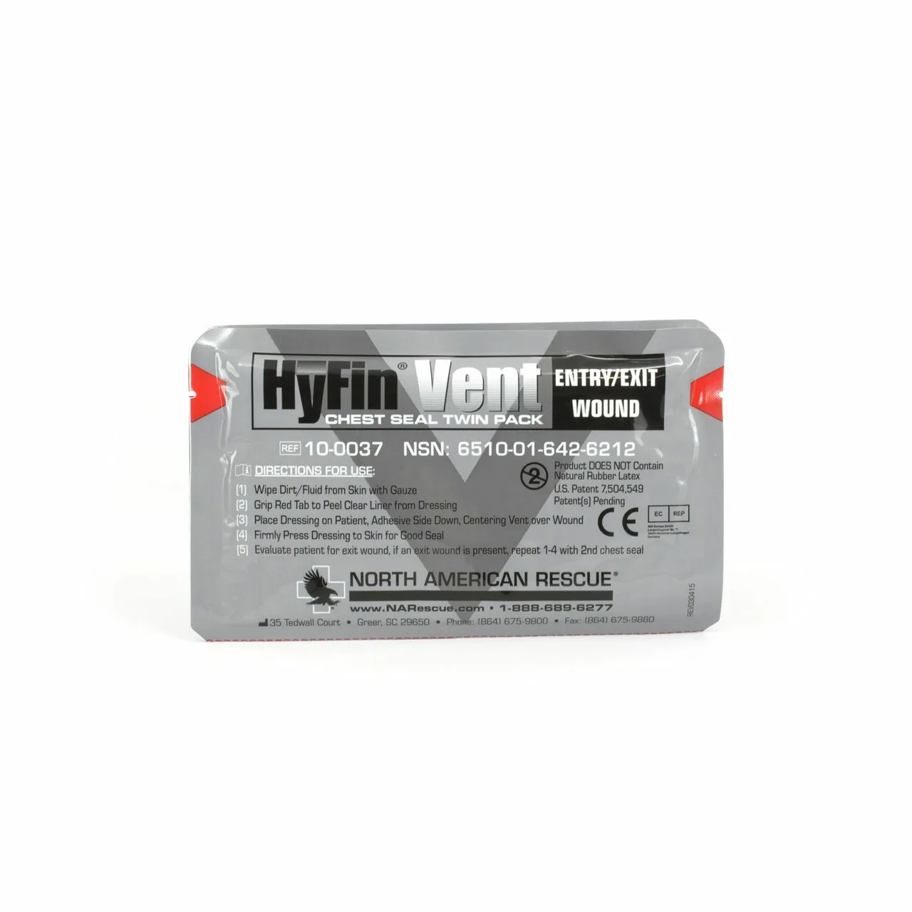 NAR packages each chest seal using its signature Red Tip Technology® red tear notches in a rugged, easy-to-open, foil pouch to ensure high quality performance. The HyFin® Vent Chest Seal Twin Pack meets or exceeds the current EMS Standard of Care and TCCC & TECC Guidelines for treatment of penetrating injuries to the chest and is the superior prehospital chest seal.