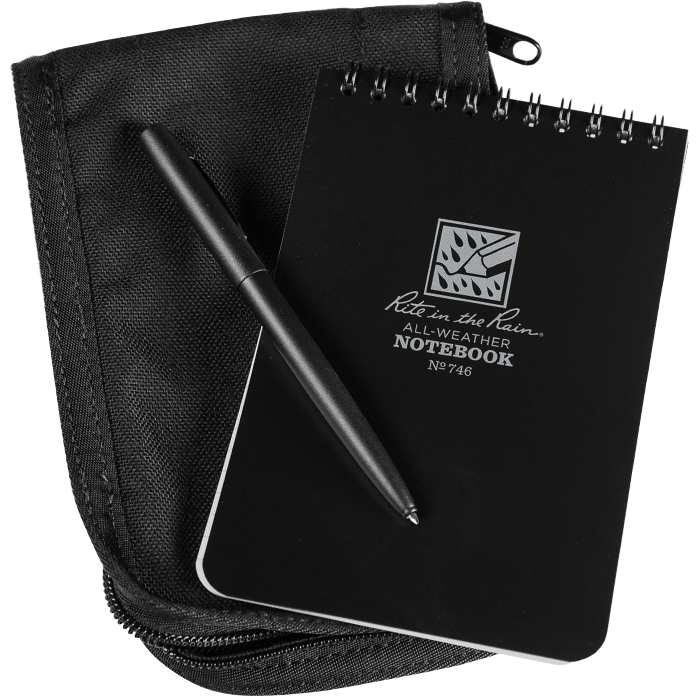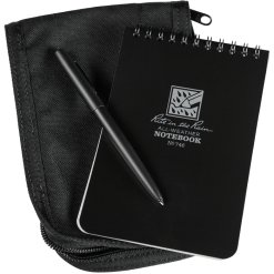 Hendig kit som inneholder nylonfutteral, penn og skriveblokk som tåler vann. Perfekt for å ta notater når det regner.