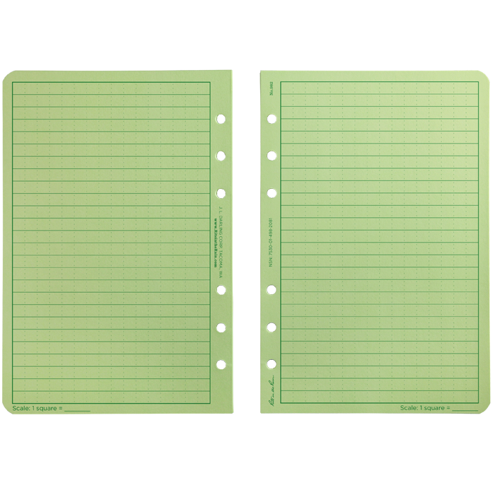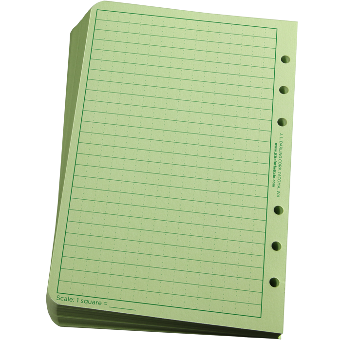 The Loose Leaf sheets have a round 6-hole punch (Franklin Covey ‘Compact’ Punch) that fits all of the Rite in the Rain Field Ring Binders . Printed on Green 32# Rite in the Rain paper. 100, 4 5/8″ x 7″ sheets per pack. Covers and kits are also available.