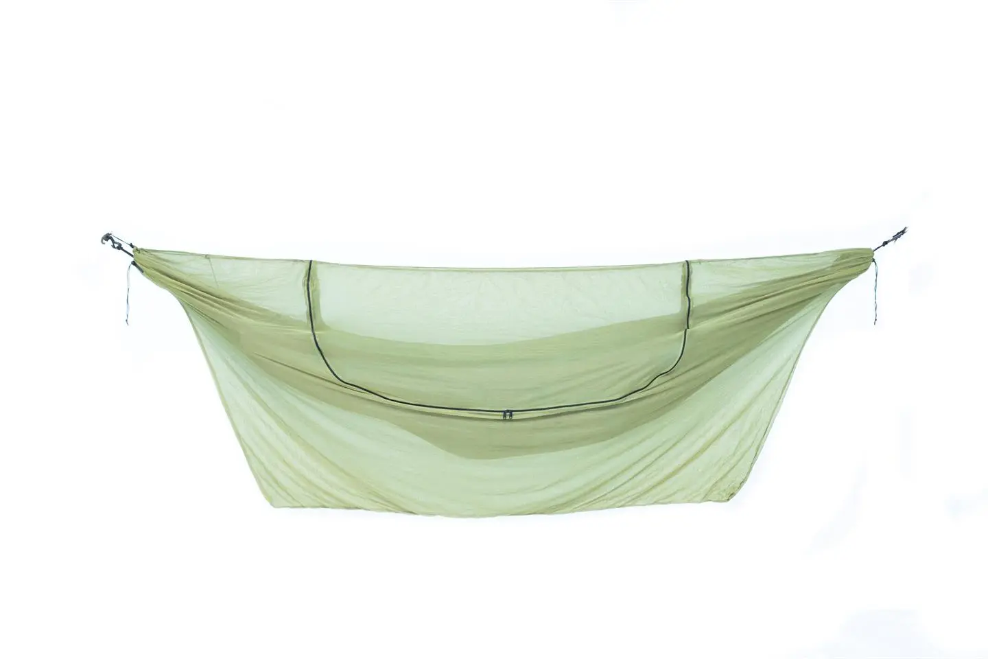 Glidelåsåpningen kan åpnes på hele toppen av myggnettet. Det gjør det enkelt å komme seg ut og inn av hengekøyen med myggnettet montert. Man kan også bruke køya som vanlig når glidelåsen er åpnet. Kommer med justerbart opphengstau. Doble glidelåser åpner hele toppen av myggnettet.
